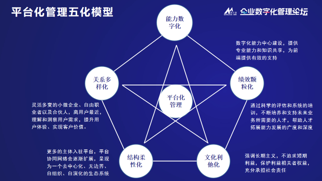 從2013年的OA,2015年ERP,到2018年開始嘗試開發(fā)人力資源系統(tǒng)直到2021年推廣使用,再到2022年數(shù)字挖掘、智能分析,以及未來的智慧平臺,智慧決策、智能投放和智能預(yù)警。博爾捷集團(tuán)的平臺化轉(zhuǎn)型實踐,以著高效的數(shù)字化的平臺和智慧化的生態(tài)平臺為依托,遵循著平臺化管理五化模型不斷進(jìn)行著。平臺化管理五化模型,更是其中的重點。
