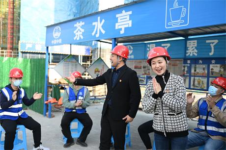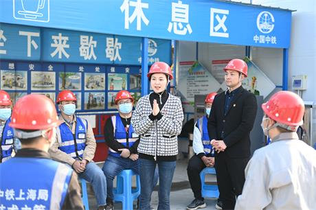 11月2日下午,在中鐵上海局三公司創(chuàng)智天地項(xiàng)目部工地,黨的二十大代表,黨的二十代代表,國家一級演員,新一代黃梅戲藝術(shù)傳承人,安徽省黃梅戲劇院的袁媛正在為工友們表演經(jīng)典的黃梅戲片段。